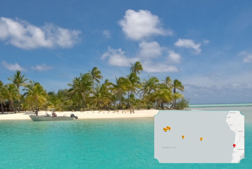 Idyllischer tropischer Strand mit weißen Sand, türkisblauem Wasser und zahlreichen Palmen unter einem sonnigen Himmel; ein kleines Boot liegt nahe am Ufer. Unten rechts ist eine kleine Karte eingeblendet, auf der mehrere markierte Punkte die Route der Kreuzfahrt durch eine Inselregion anzeigen.